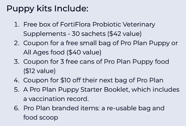 Lorsque vous achetez un chiot Pomsky Teacup chez nous, vous recevez votre kit de démarrage pour chiot ainsi qu'un coupon pour votre prochain achat de nourriture Purina Proplan pour chiots.